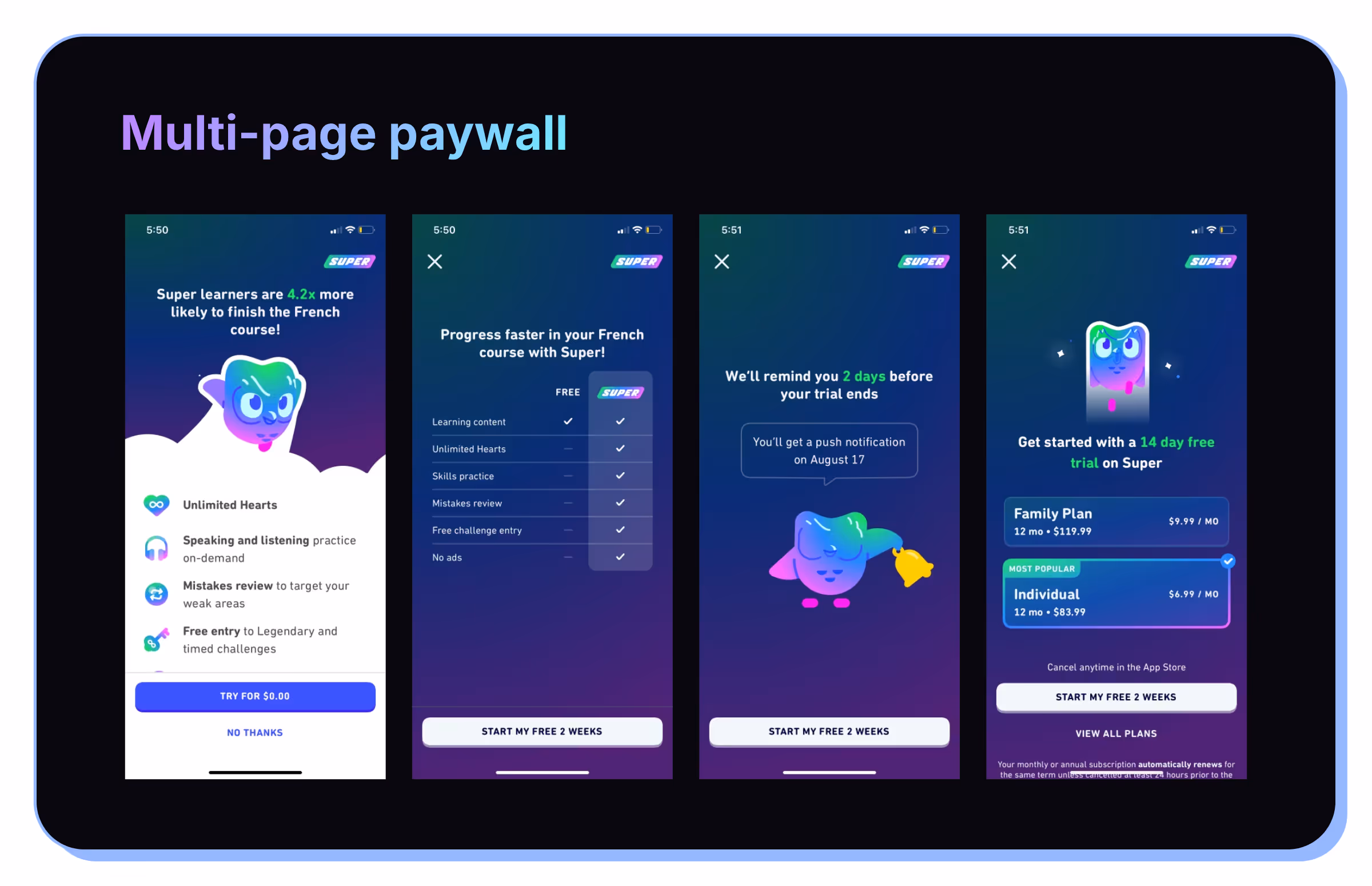 Continuing with Duolingo, a great test can be using a multi-page paywall approach. This effectively breaks up the trial timeline view in multiple screens.