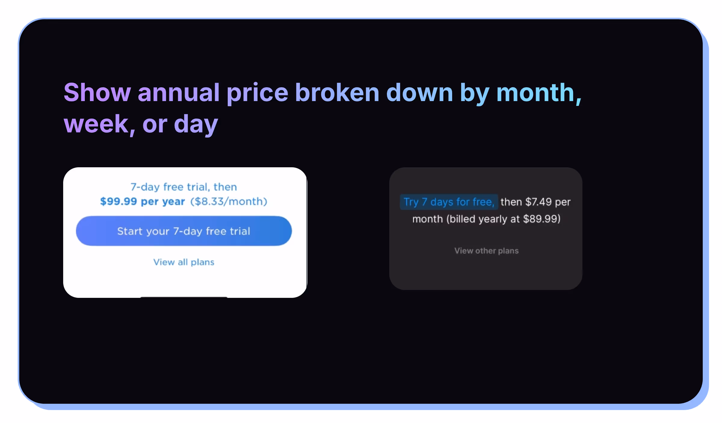 An easy win can be breaking down an annual product’s price by month, week, or day to make it seem less expensive.