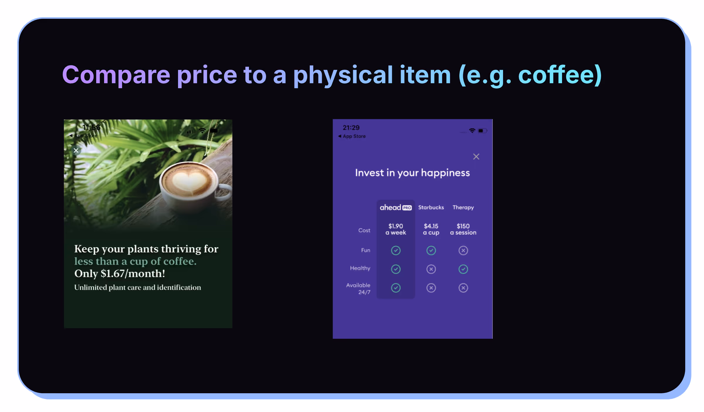 This isn’t directly on the paywall, but is often effective right before the paywall to compare/contrast the benefits user’s will receive to build up extra motivation right before the paywall.