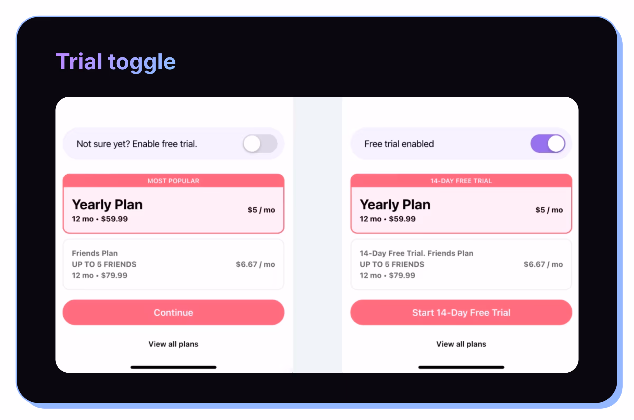This is a pretty cool one. Add a toggle on your paywall that goes back and forth between offering a trial or not.