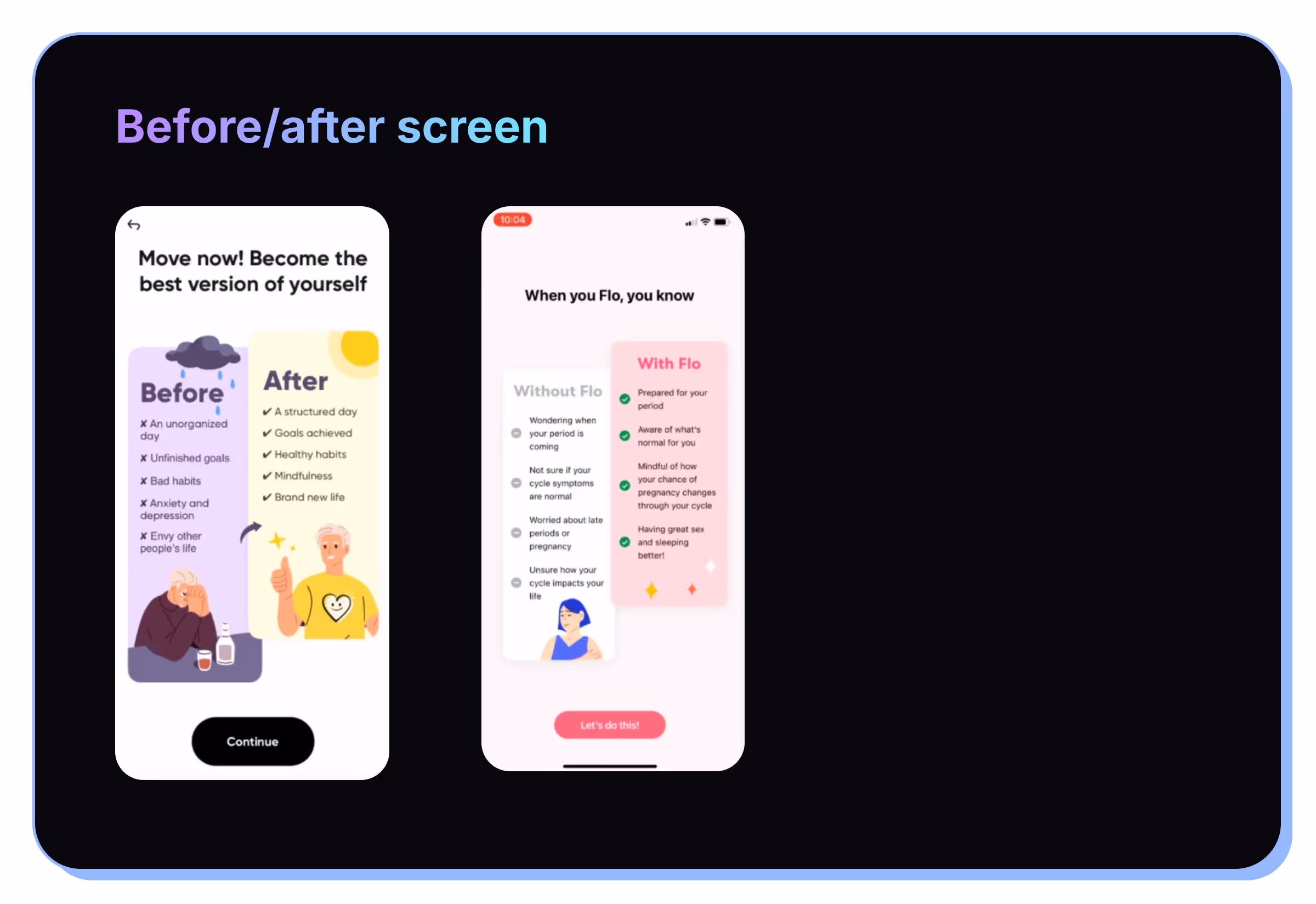 - Before/after screen