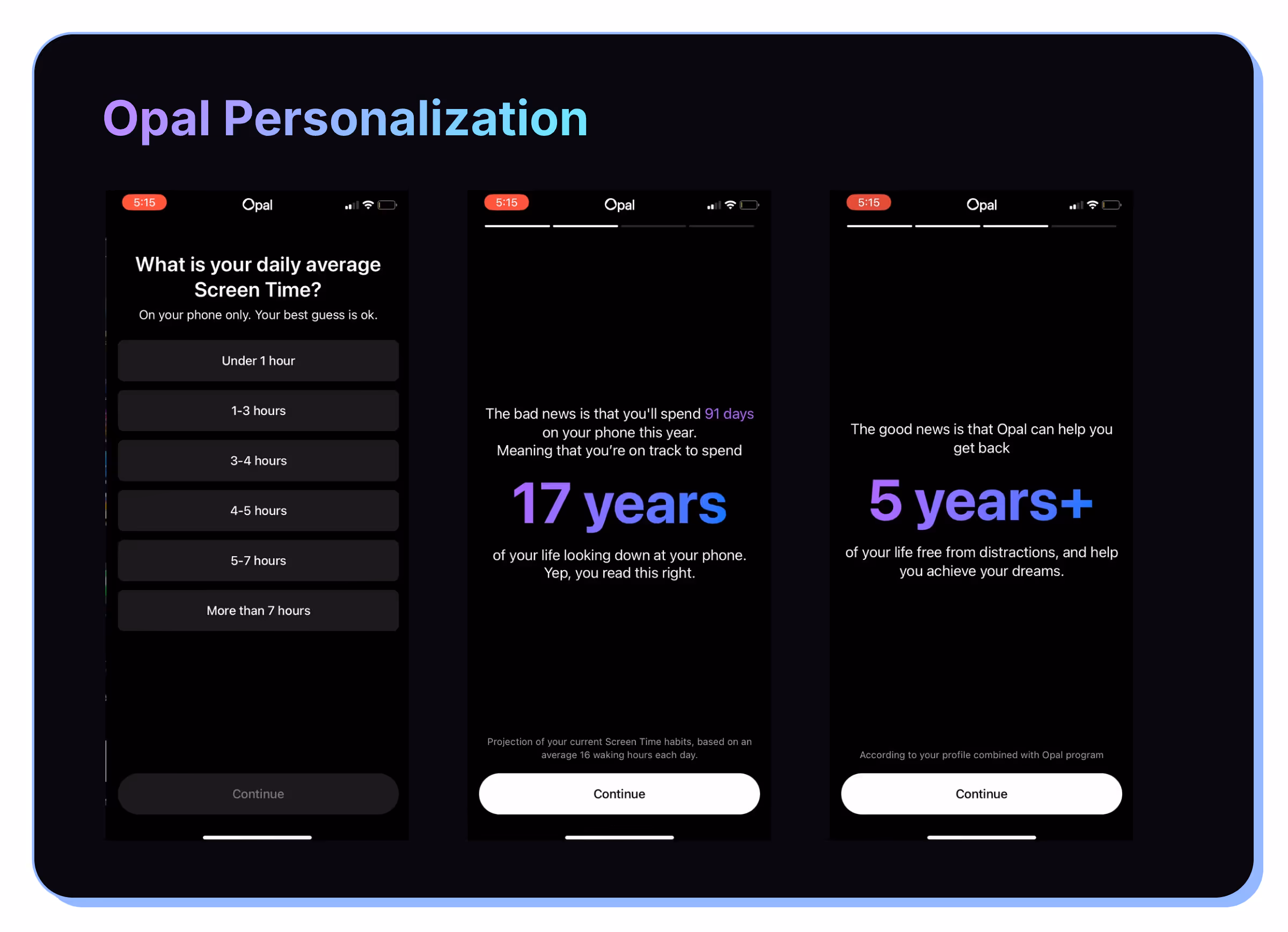 Opal has an onboarding flow where they calculate the amount of time they could save you in your life using their screen time blocking.