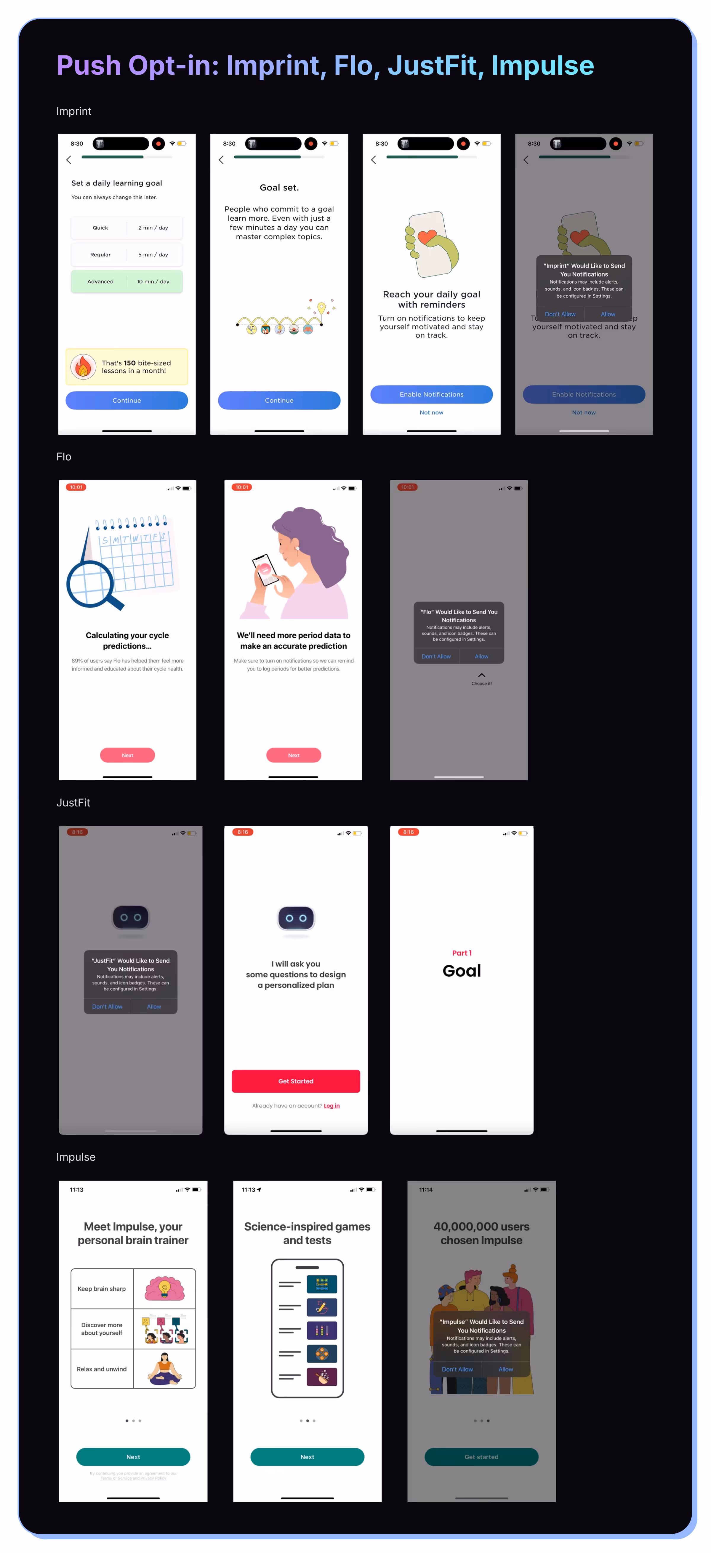 JustFit and Impulse show the notification prompt almost immediately upon app open. This is an underrated tactic and can often work quite well to get decently high opt-in rates.