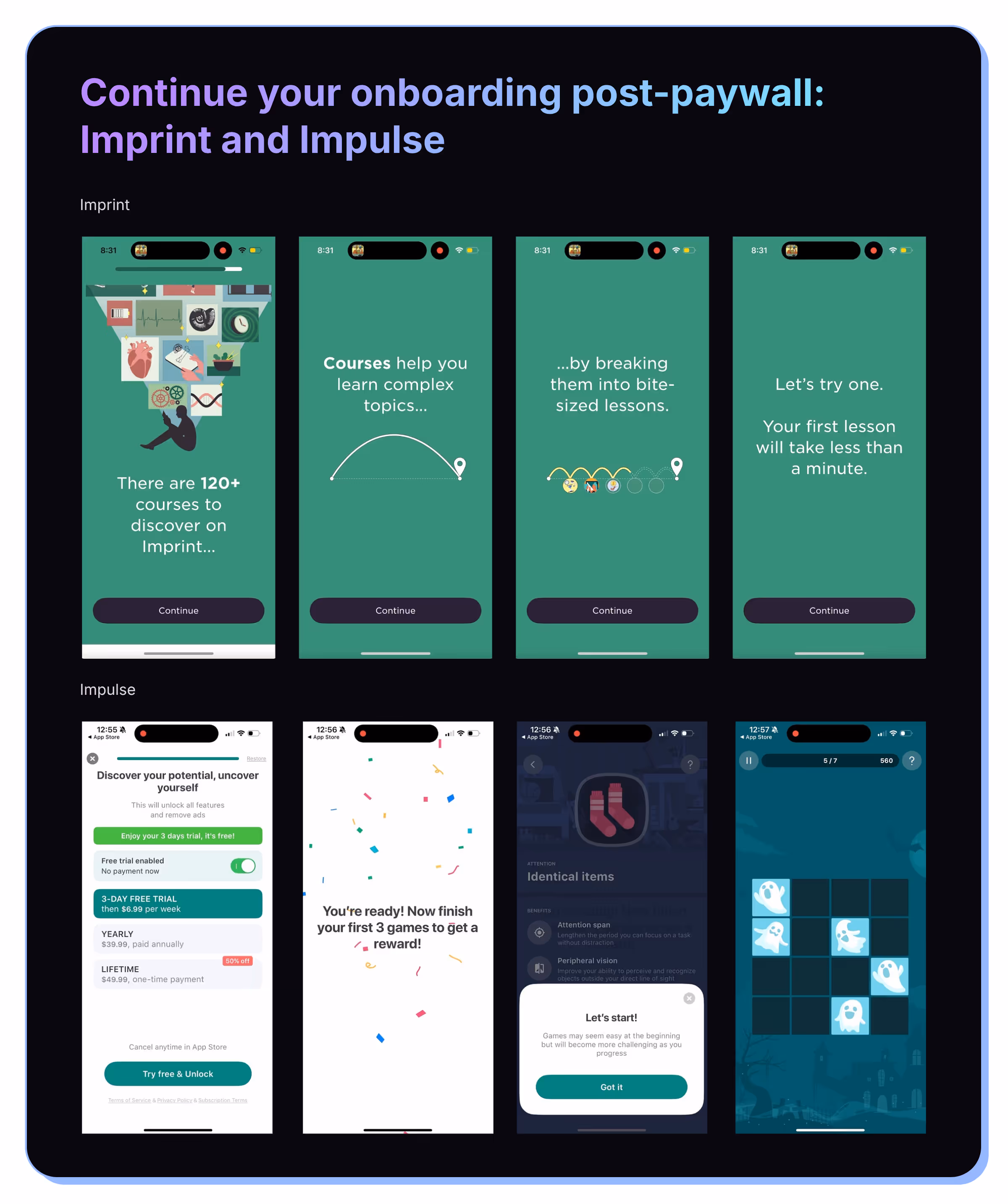 Impulse has a gamified flow, so if you don’t convert on the first paywall, it introduces you to their brain games, but also motivates you through promising a reward (which ends up being a discounted subscription offer.