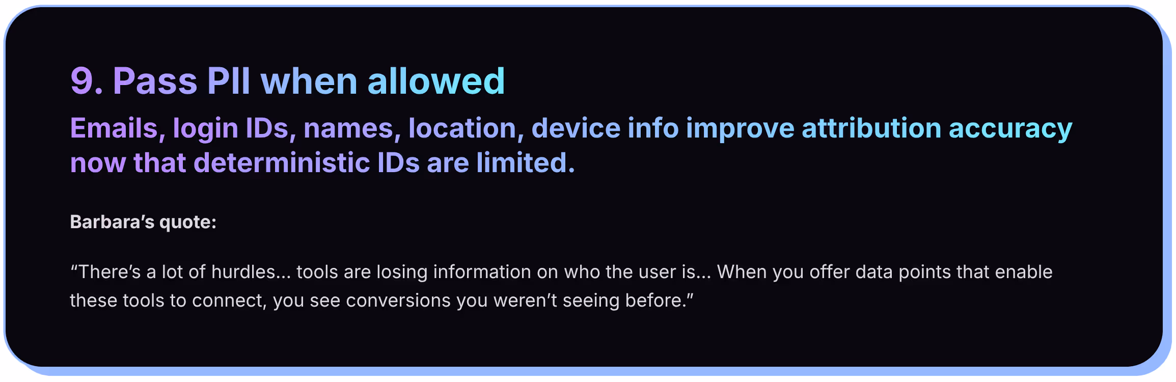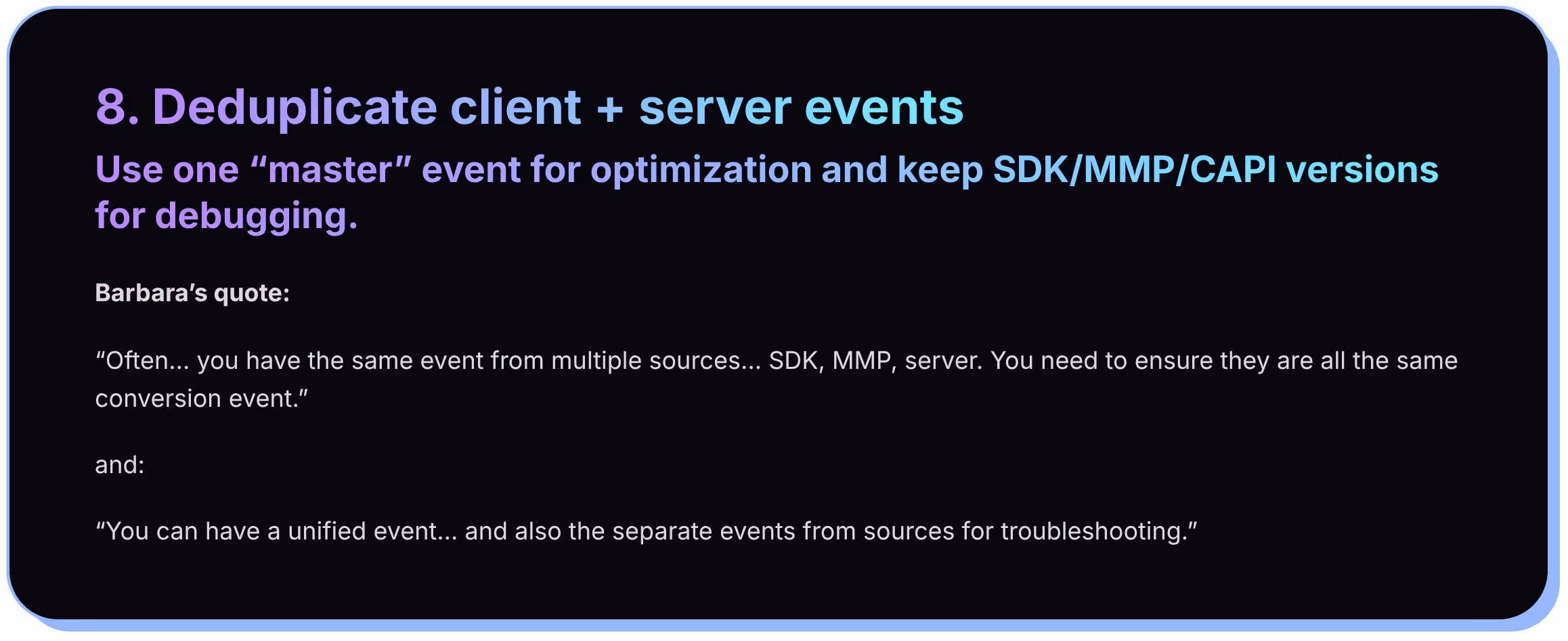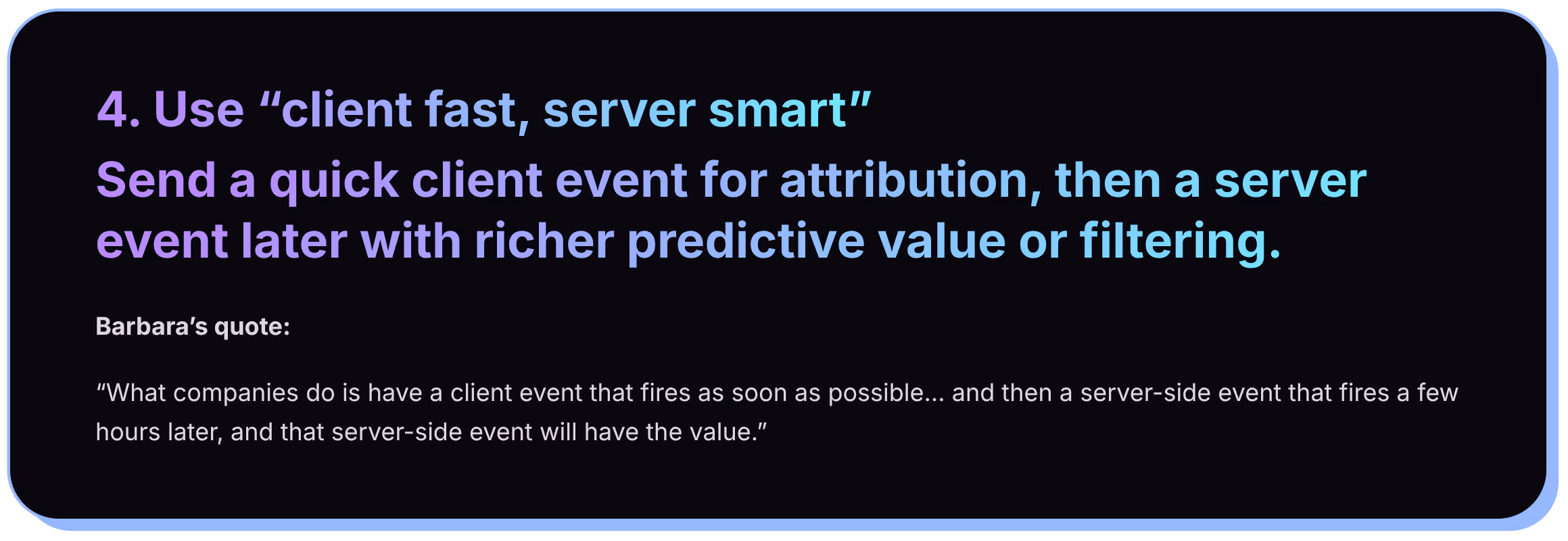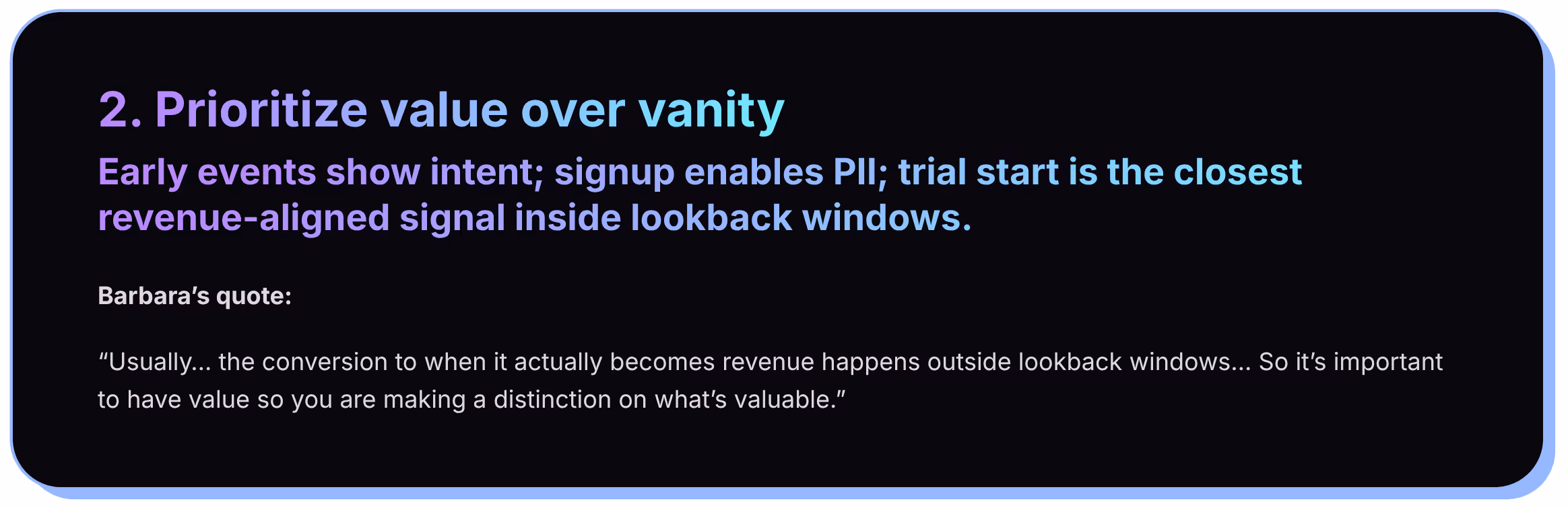 Barbara notes that teams think event volume helps, but in practice it slows marketing and creates internal distrust in the data. Three key events are usually enough for ad platform optimization: