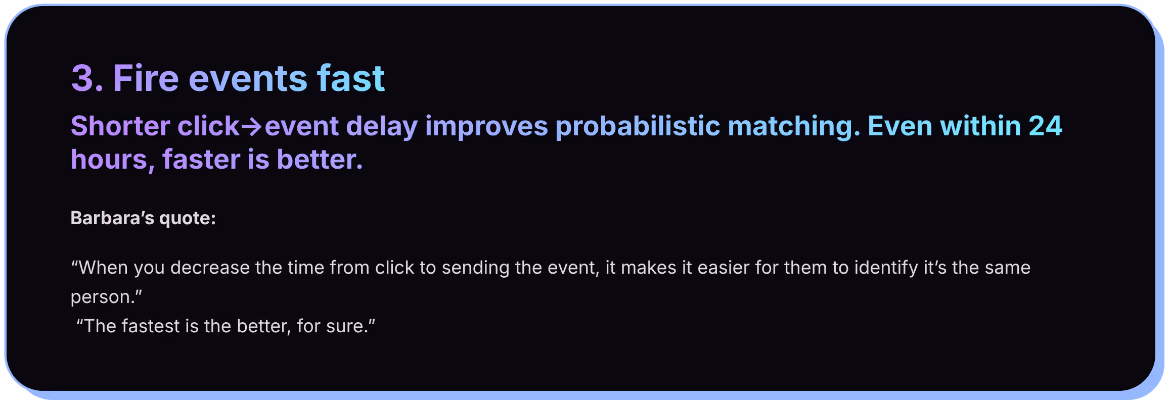 In a post-IDFA world, ad platforms rely heavily on probabilistic matching. Every minute between click → app store → install → open introduces identity drift or device/browser hops.