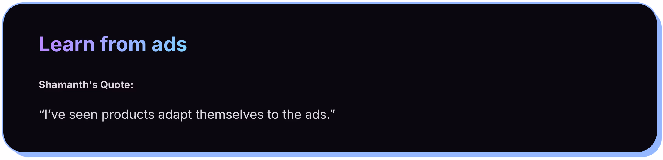 Instead of trying to make one ad that works for everyone, break your creative into smaller ideas. Focus on one motivation, one pain point, or one situation per creative. Let the platforms do the distribution. Your job is to give them enough distinct angles to work with.
