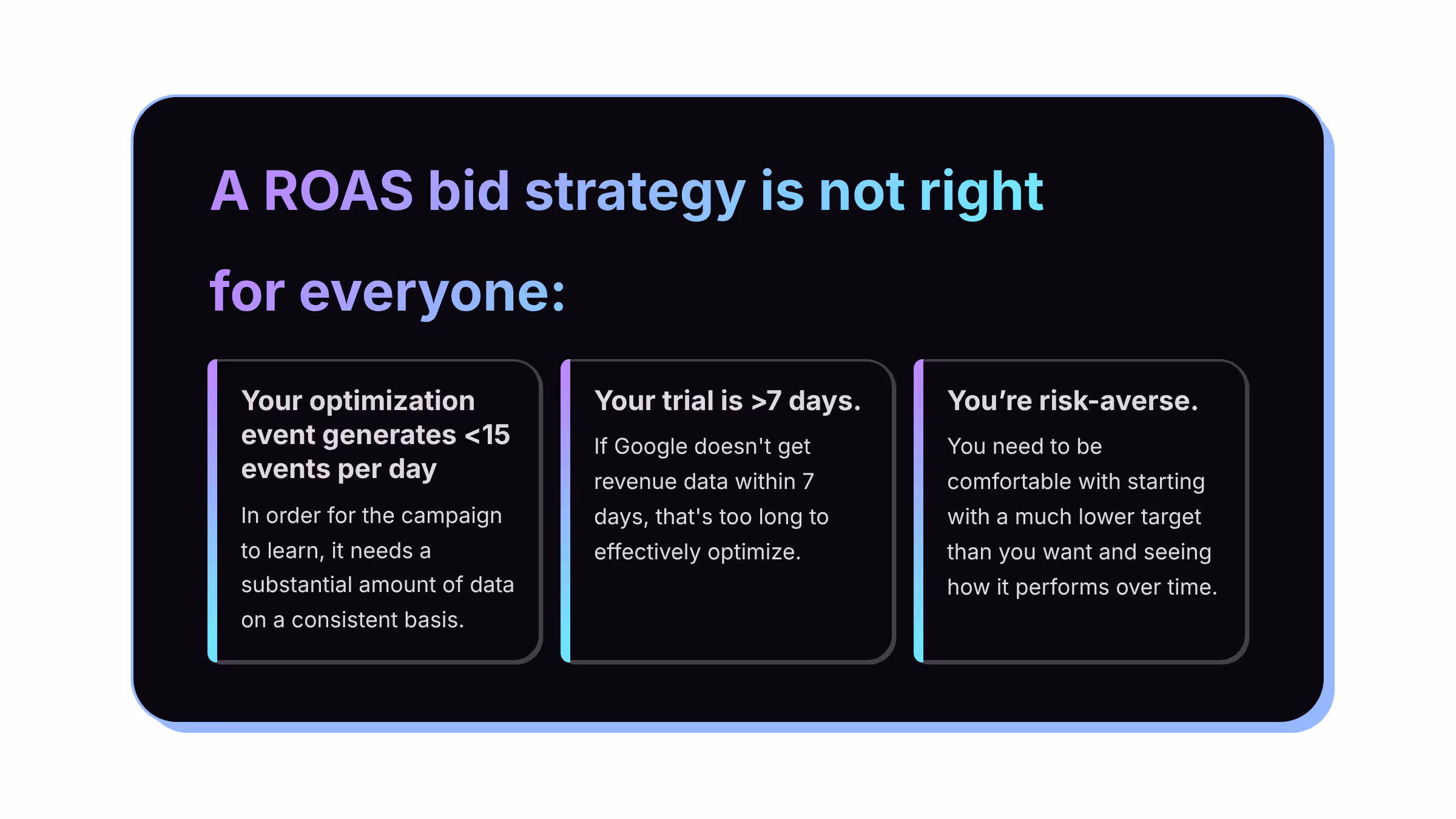 - tROAS bidding can take time to get right. You need to be comfortable with starting with a much lower target than you want and seeing how it performs over time. If this feels like too much of a gamble, you may need to reconsider.