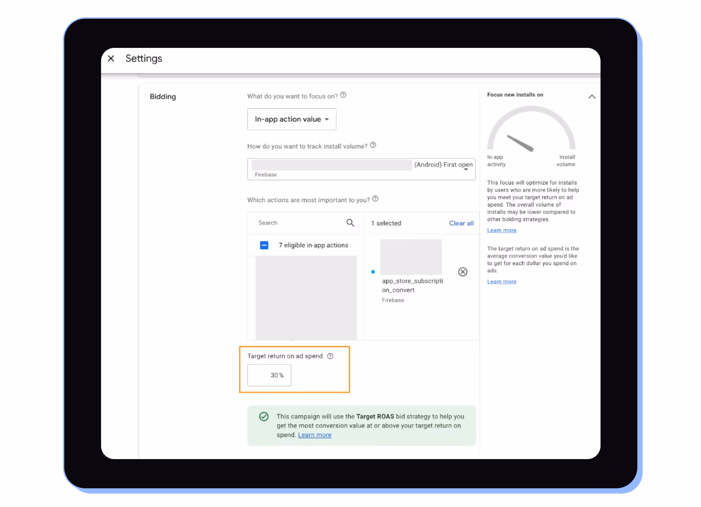 Step 2: After verifying all conversions are set up correctly, you can create your ROAS campaign. Once you get to the “bidding” section of the build, you’ll see the option to select “in-app action value” as the bid type. This is the tROAS campaign type.